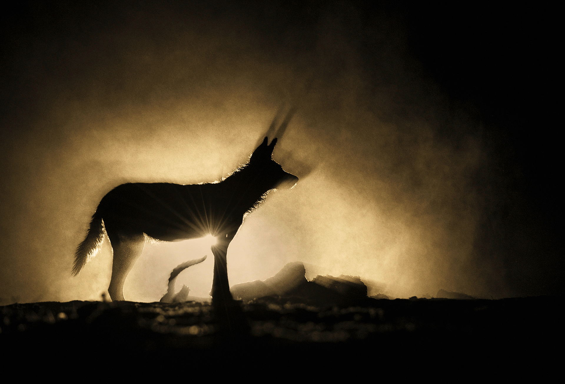 SOLD OUT Shadow and Soul - There are few places wilder than the backwaters of Zimbabwe’s Mana Pools National Park. It was here that I was camped when a pack of Cape Hunting Dog (also known as painted wolves or wild dog), killed an impala antelope. The subsequent feeding frenzy resulted in a plume of dust, onto which my subject's shadow was cast.