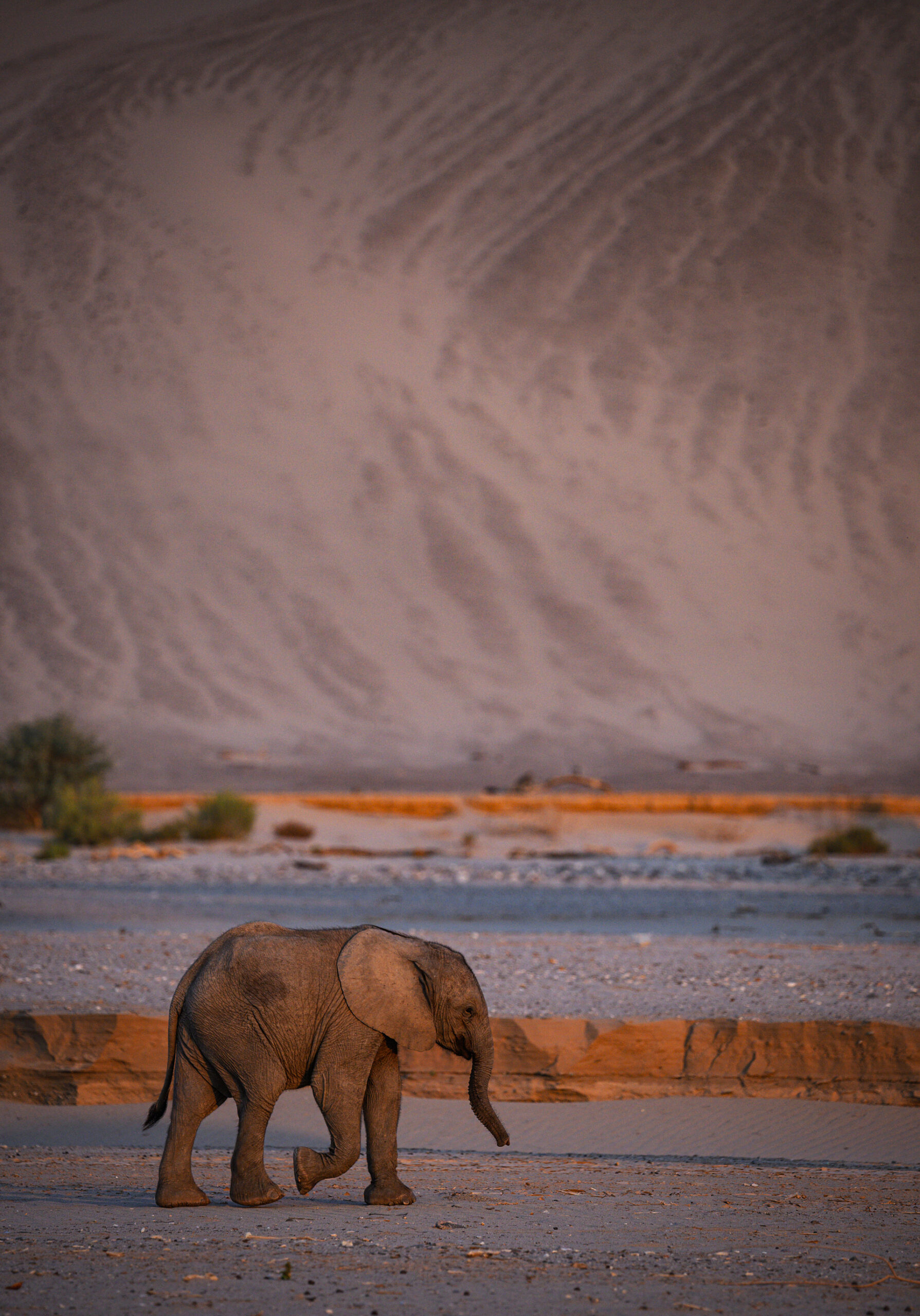 In the soft glow, at the end of another African day, a baby desert elephant trails behind its mother. Although the conditions seem tough, this little one’s mother knows exactly where to find water and food and the little elie’s future is bright (Hoanib River, Namibia Skeleton Coast).