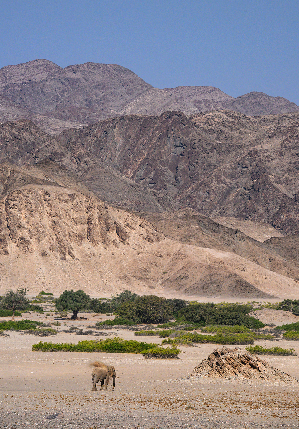 In a faraway wilderness, an ancient and desolate land, the oldest desert in the world meets the Atlantic coastline. Here, along Namibia’s Skeleton Coast you find a miracle in the form of desert-adapted elephants. This bull not only survives in these harsh conditions but relishes the desert and dust (Hoanib River, Namibia Skeleton Coast).