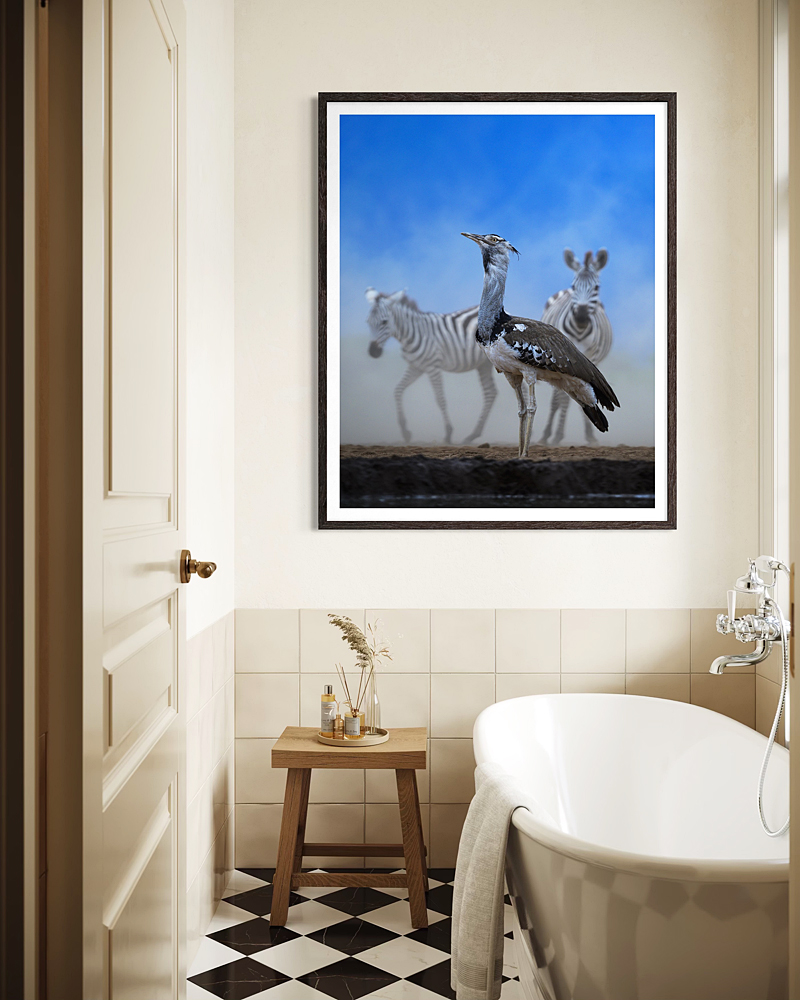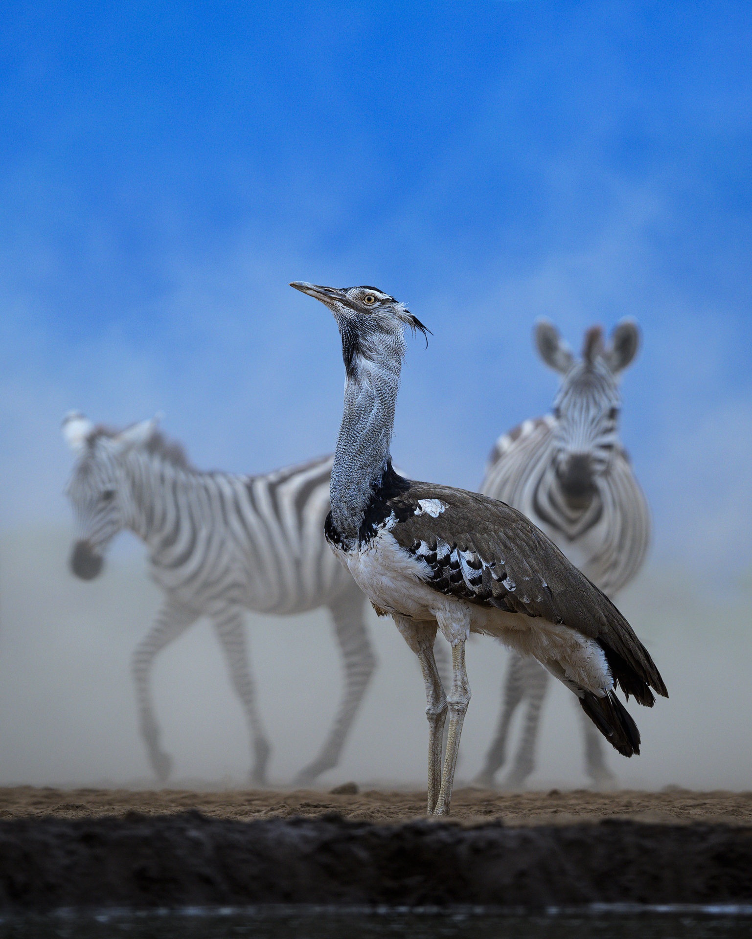 Many years ago I spent sixteen months staking out a waterhole in Kenya’s Shompole region, with my film camera. Eighteen years later I returned, and this time it was sitting in a luxury hide and with a digital camera, that I took this photograph. Zebra, dust and a Kori Bustard – all icons of Shompole and a place very close to my heart.